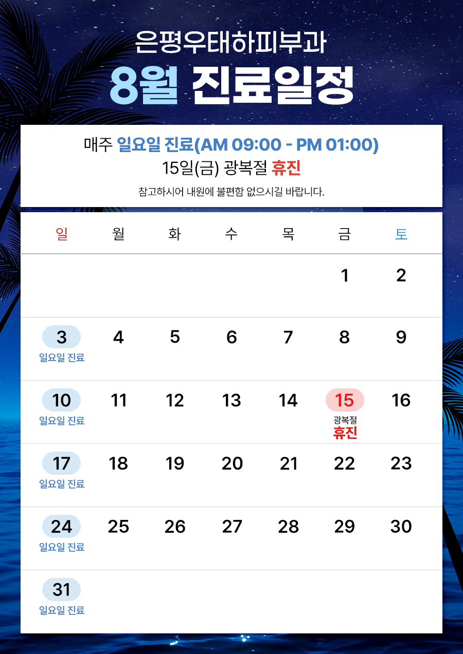안녕하세요. 은평우태하피부과입니다.8월 진료일정을 안내드립니다.